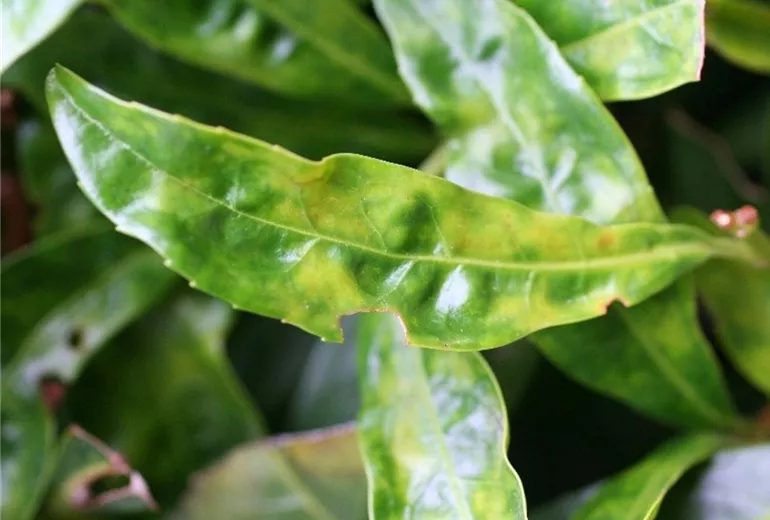 Im Hoch- oder Spätsommer sind junge Blätter und Triebe heller gefärbt, als normal. Insgesamt bleiben die Blätter auch kleiner, sie sind wellig verkrüppelt und das Triebwachstum ist gebremst.