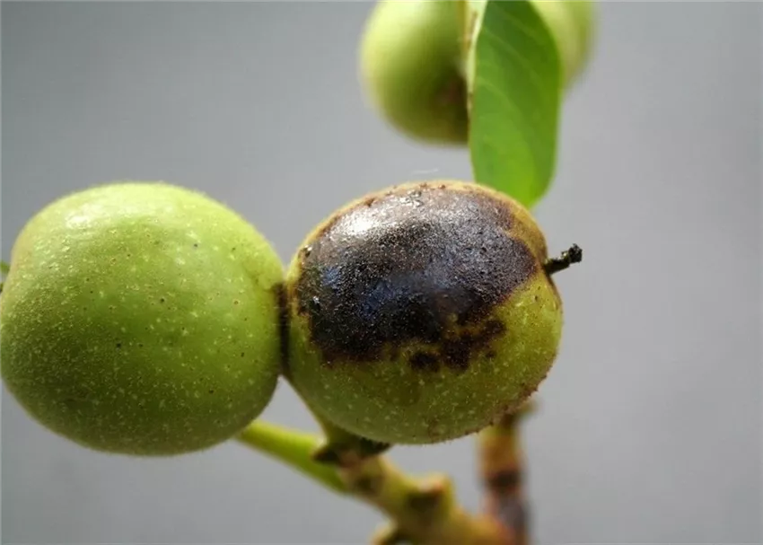 Auf der grünen Fruchtschale bilden sich schwarze Flecken, die sich im Laufe der Zeit vergrößern. Normalerweise ist nur die Fruchtschale betroffen. Nur in Ausnahmefällen dringt die Krankheit bis in den Kern vor. Auf den Blättern entstehen bei Befall eine große Zahl kleiner dunkelbrauner Flecke von eckiger Gestalt. Bei starkem Befall kann es zu vorzeitigem Blattfall im August/September kommen.