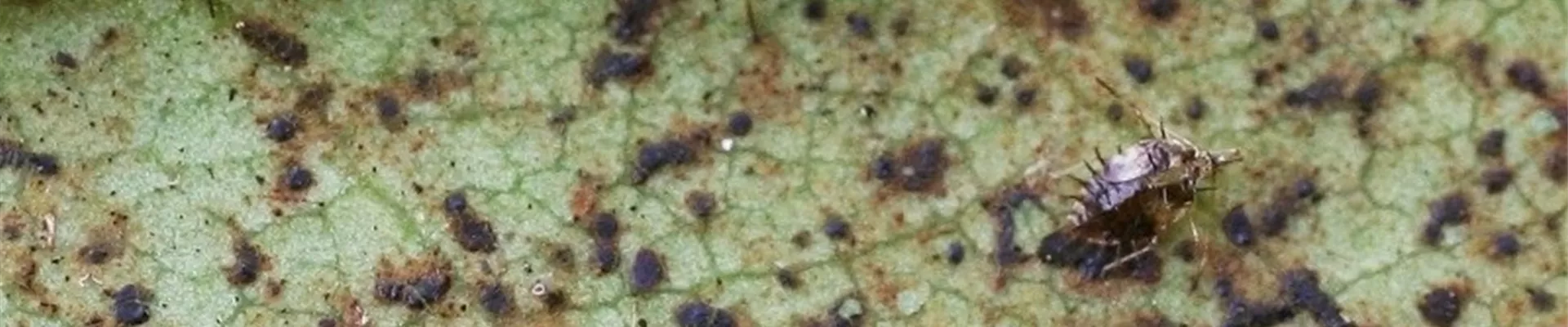 Die Rhododendronhaut- oder Netzwanzen (Stephanitis rhododendri) und ihre Larven saugen mit ihrem langen Stechrüssel an den Blättern. Ab Mitte Mai schlüpfen die Larven aus den Eiern, die zwischen August und Oktober des Vorjahres von den erwachsenen Wanzen gelegt wurden.