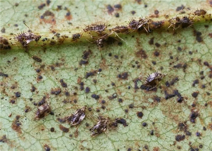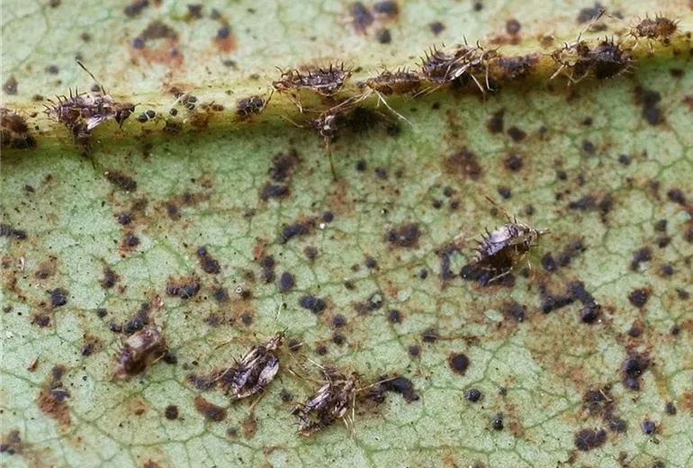 Die Blattunterseiten erscheinen "rostartig" und man findet schwarze, lackartige Kottröpfchen des Schädlings.