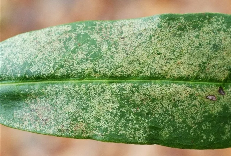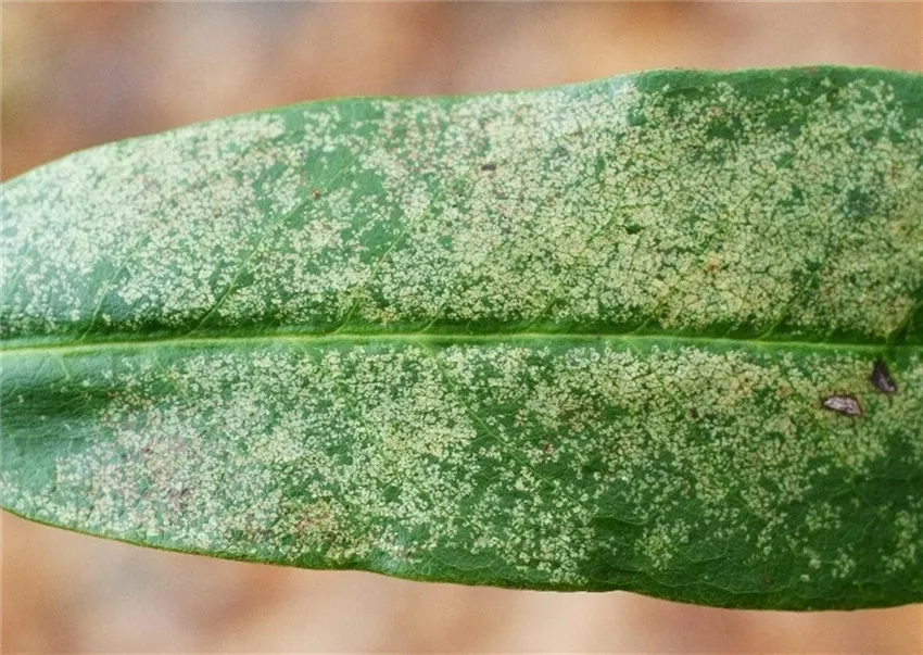 Die Blätter zeigen feine Sprenkelungen, die bei stärkerem Befall das Blatt verbräunen lassen.