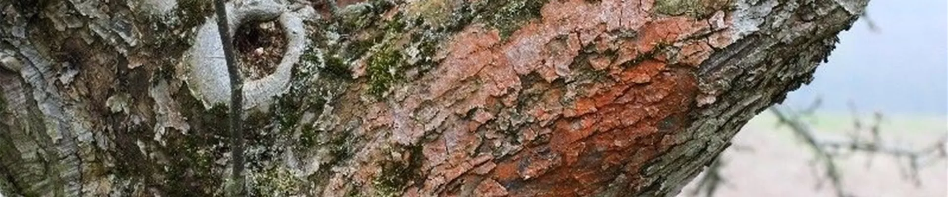 Diese auffällige Verfärbung wird durch Algen verursacht, die sich unter feuchten Bedingungen auf der Borke älterer Bäume entwickeln.