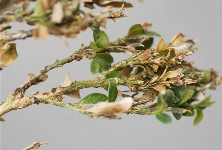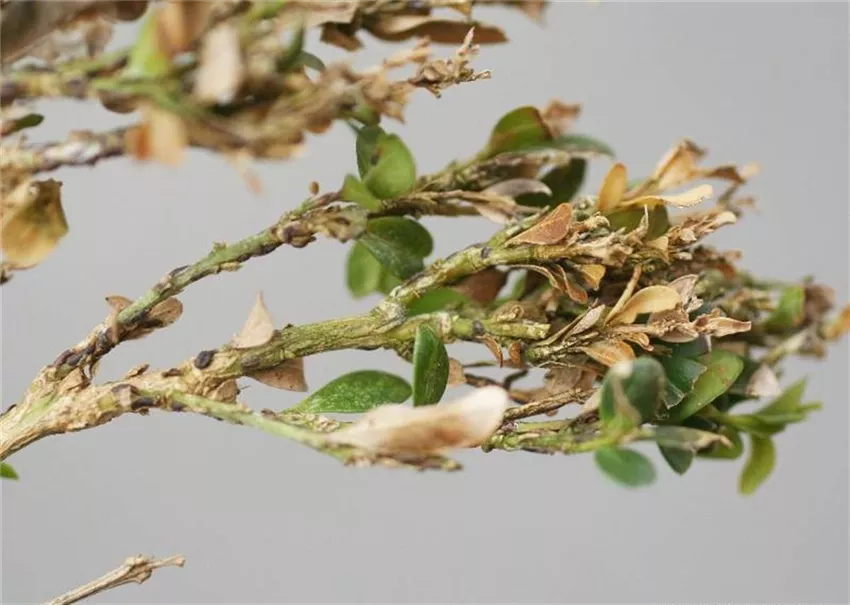 An Buchsbaum tritt gelegentlich die Kommaschildlaus (Lepidosaphes ulmi) auf. Durch die Saugtätigkeit dieses Schädlings welken die Blätter und junge Triebe.