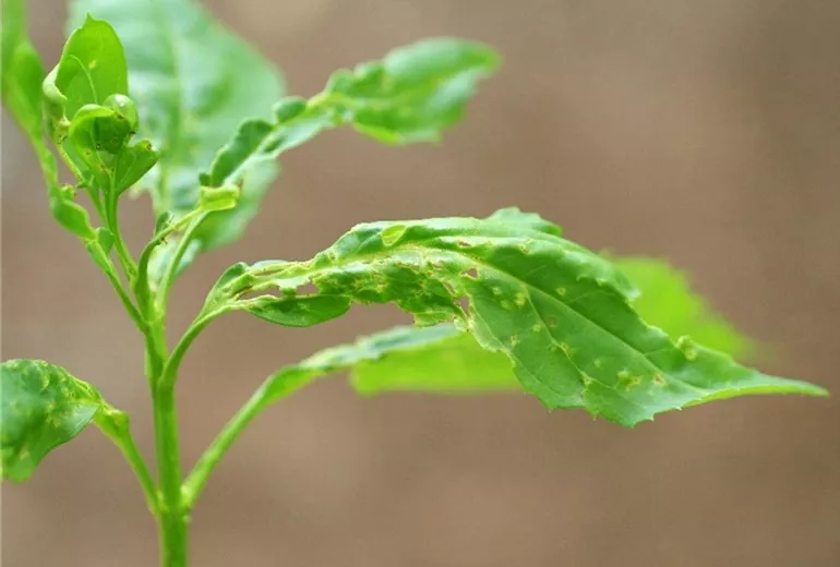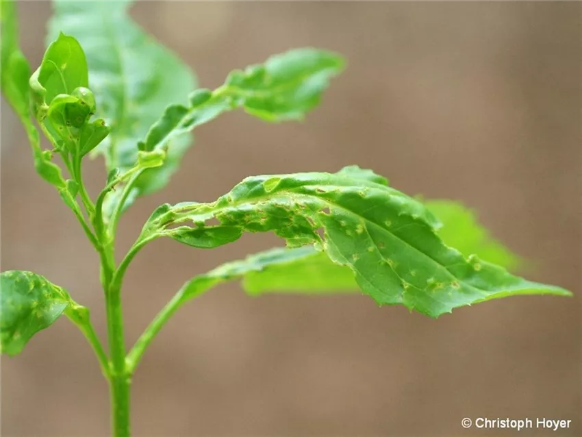 Vor allem jüngere Blätter sind deformiert. Sie erscheinen zerstochen oder löchrig. Bei starkem Befall können auch junge noch weiche Triebspitzen geschädigt sein.