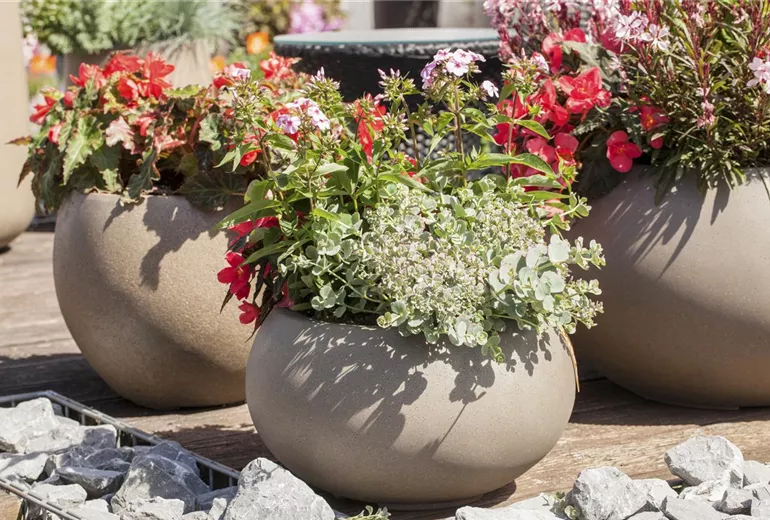 Wer es in seinem Garten, auf der Terrasse oder auf dem Balkon lieber harmonisch haben möchte, der greift zu einer Grundfarbe und deren Farbabstufungen. So ergibt sich zum Beispiel aus Rot ein Arrangement mit Orange und Dunkelgelb. Das wirkt harmonisch auf das Auge und strahlt Wärme aus. Bestimmte Farben sprechen bestimmte Gefühle an. So erzeugen Rottöne Wärme, während Blautöne eher kühl und distanziert wirken. Trotzdem können Blau und Violett ebenfalls harmonisch und beruhigend wirken. Bei der Auswahl der Grundfarbe kommt es ganz darauf an, was arrangiert werden soll. In einem Blumenbeet können mehrere farbliche Zonen gestaltet werden. In einem Kübel oder Pflanzgefäß bietet es sich aufgrund des begrenzten Platzes an, sich auf eine Grundfarbe zu beschränken und die Farbabstufungen drumherum zu platzieren.