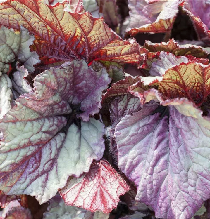 Hoher Blattschmuckwert. Die immergrünen Blätter der Königsbegonie sind bunt, herzförmig, gewellt.