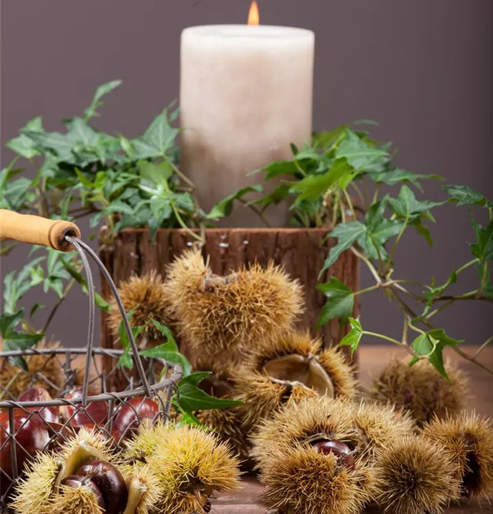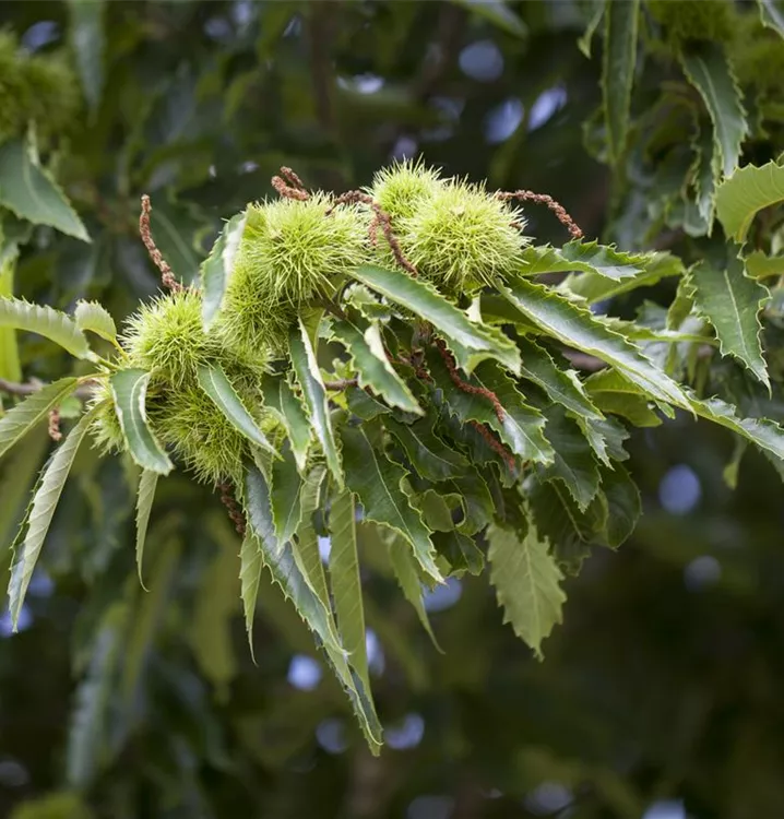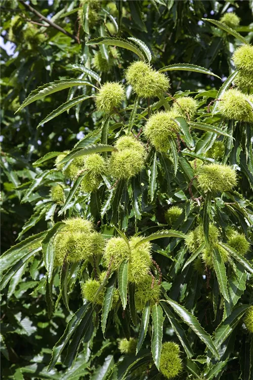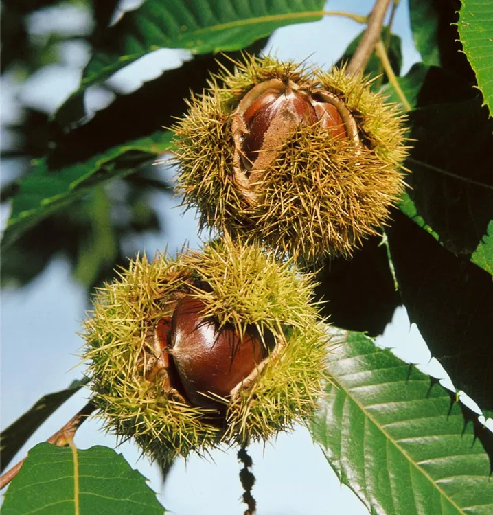 Castanea sativa bildet braune Früchte mit einem mehligen Geschmack. Die Fruchtschale ist stachelig. Reifezeit ab Oktober.