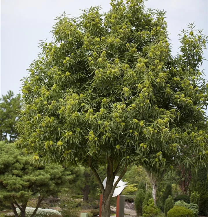 Die Esskastanie (Castanea sativa) ein ausladender Großbaum, der, je nach Sorte, Blüten in verschiedenen Farben hervorbringt. Ihre Rinde ist dunkelgrau, netzartig eingerissen. An einem sonnigen bis halbschattigen Standort mit durchlässigem, nährstoffreichem, saurem Boden erreicht sie gewöhnlich eine Höhe von ca. 30 m und wird ca. 15 m breit.
