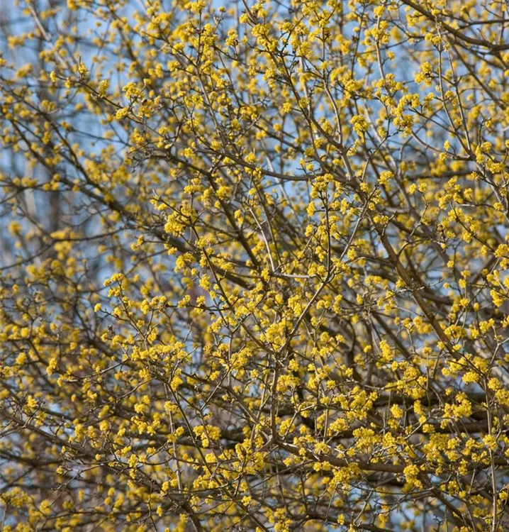 Die goldgelben Blüten der Kornelkirsche erscheinen in Dolden von März bis April. Diese sind leicht duftend.