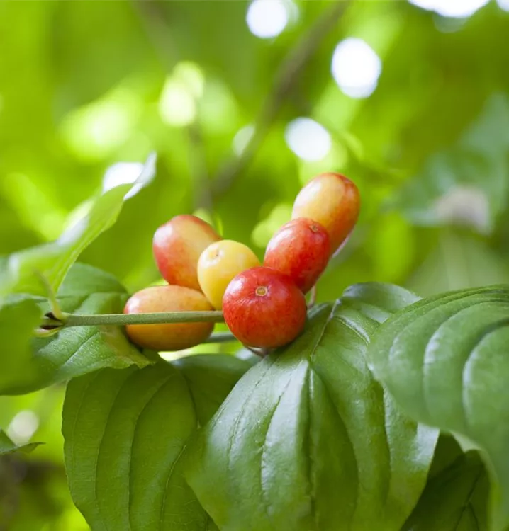 Besonders dekorativ sind die roten, ovalen Steinfrüchte von Cornus mas. Diese erscheinen ab August.