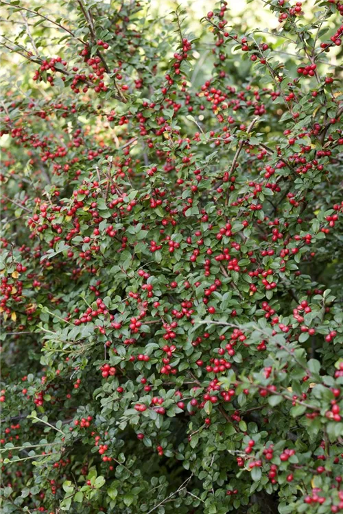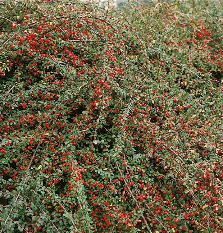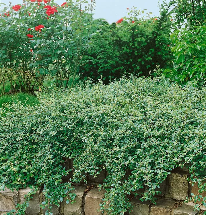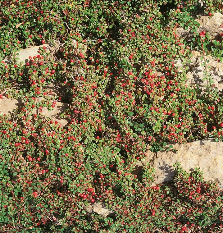 Besonders dekorativ sind die roten, runden Beeren von Cotoneaster dammeri. Diese erscheinen ab August.