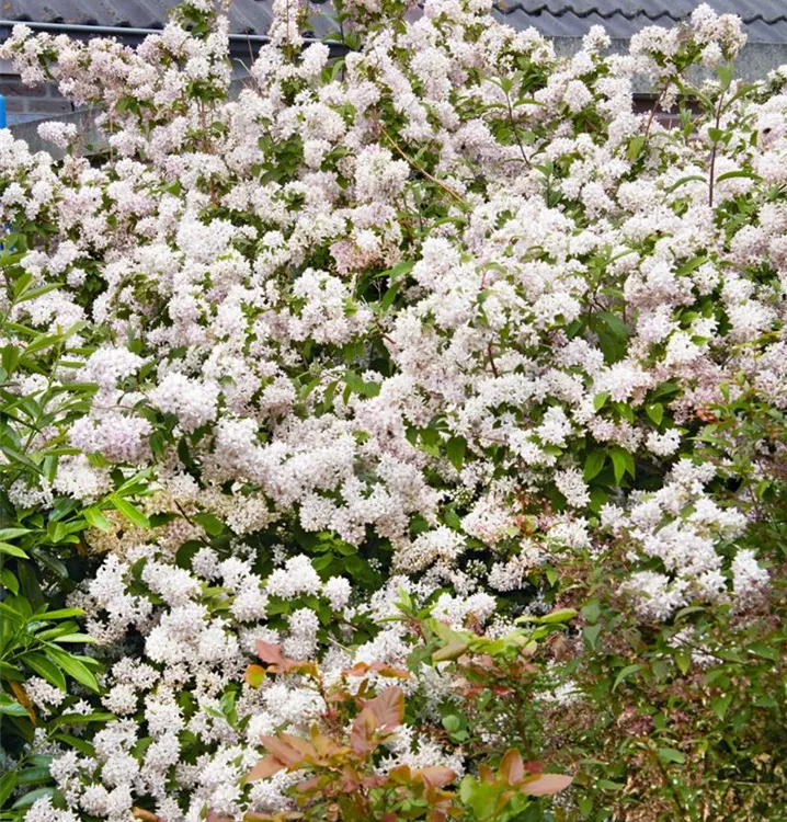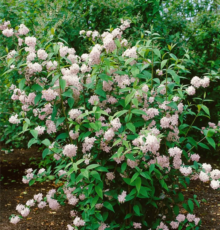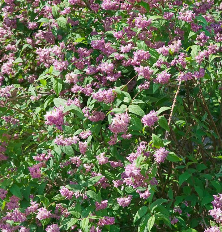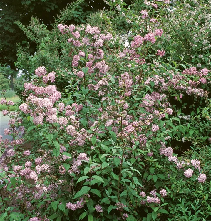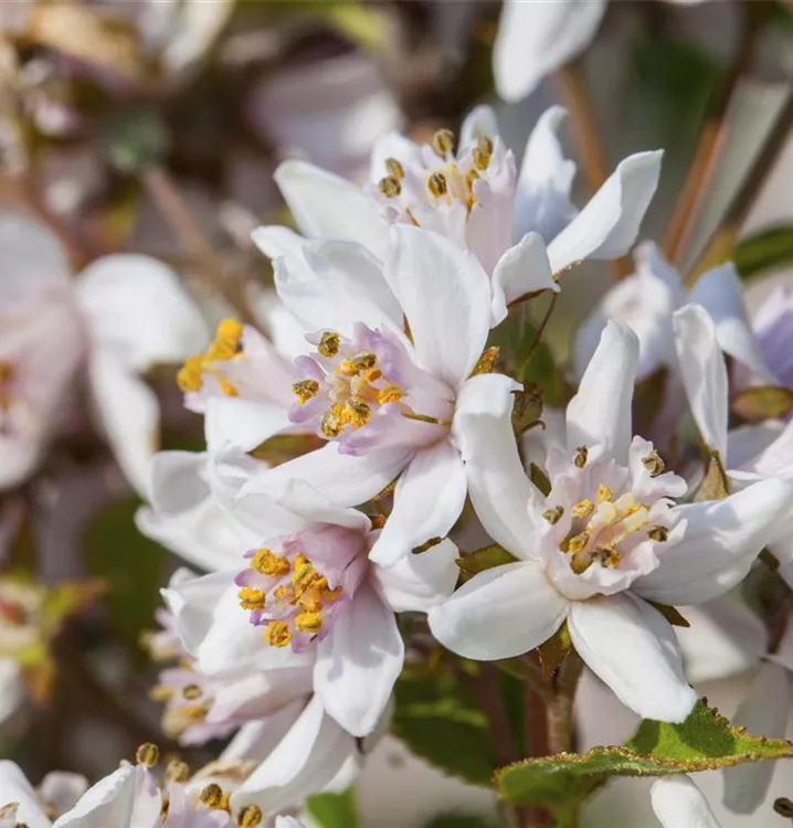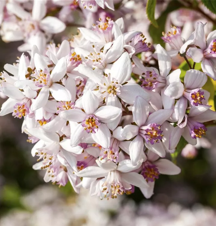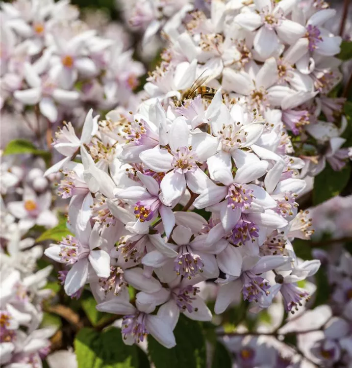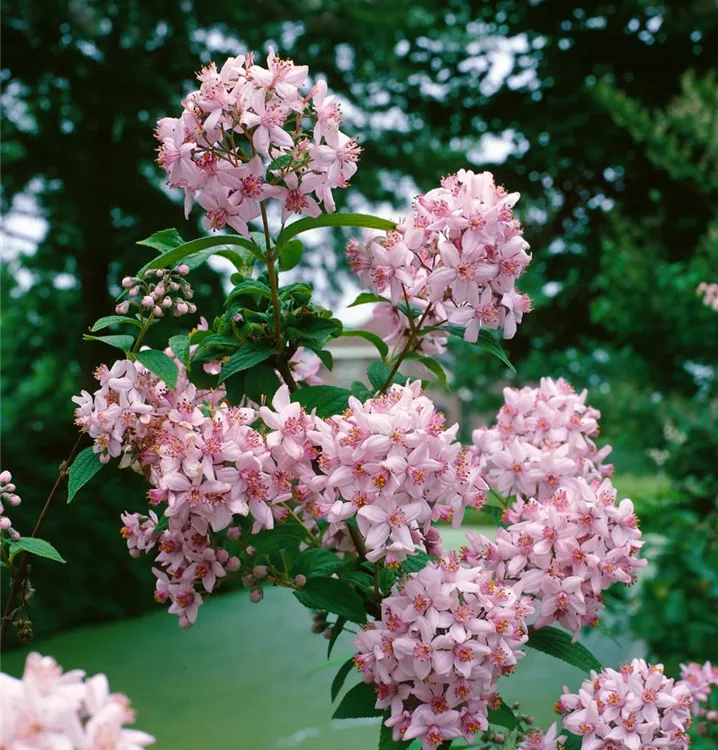 Die Deutzie (Deutzia x hybrida) eine Gartenpflanze, die, je nach Sorte, Blüten in verschiedenen Farben hervorbringt. An einem sonnigen bis halbschattigen Standort mit durchlässigem, nährstoffreichem Boden erreicht sie gewöhnlich eine Höhe von ca. 2 m und wird ca. 1,5 m breit.