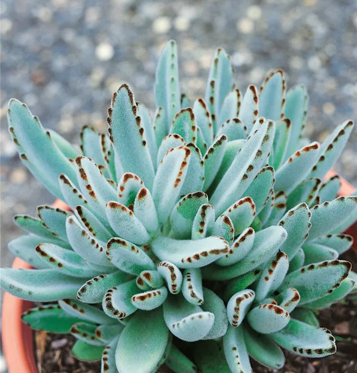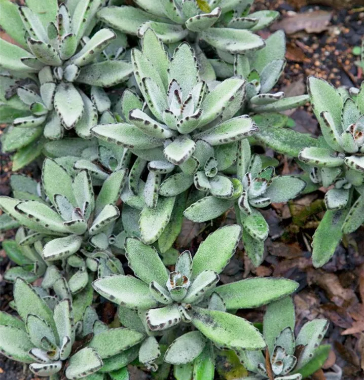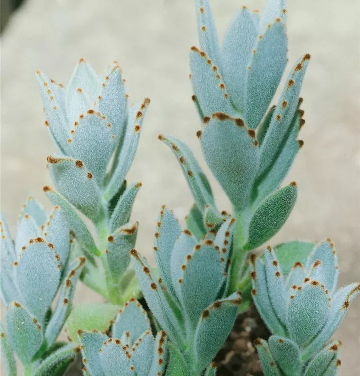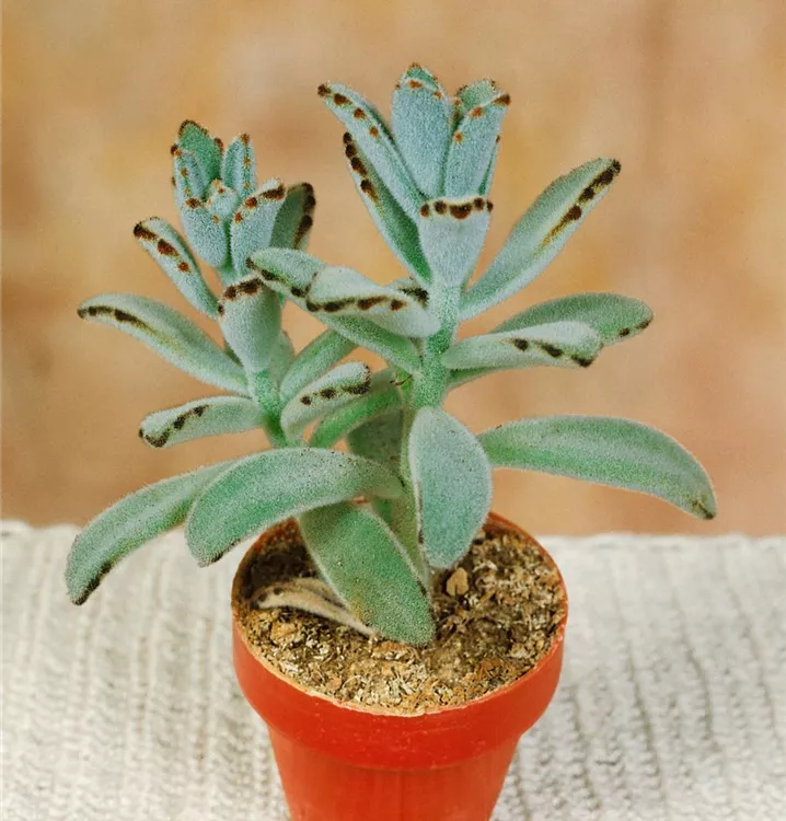 Die Pandapflanze (Kalanchoe tomentosa) ist eine orangegelb blühende Pflanze, die eiförmige, dickfleischige, blau-graue, gesägte Blätter trägt. Ihre becherförmigen Blüten erscheinen von Dezember bis April. Diese rosettenartige und sukkulente Pflanze gedeiht am besten an einem sonnigen bis halbschattigen Standort.