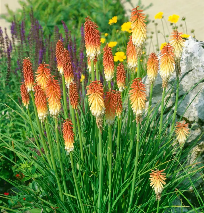 Kniphofia uvaria bildet in Kolben angeordnete, orange-rote Blüten ab Juli.