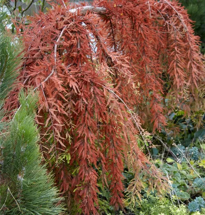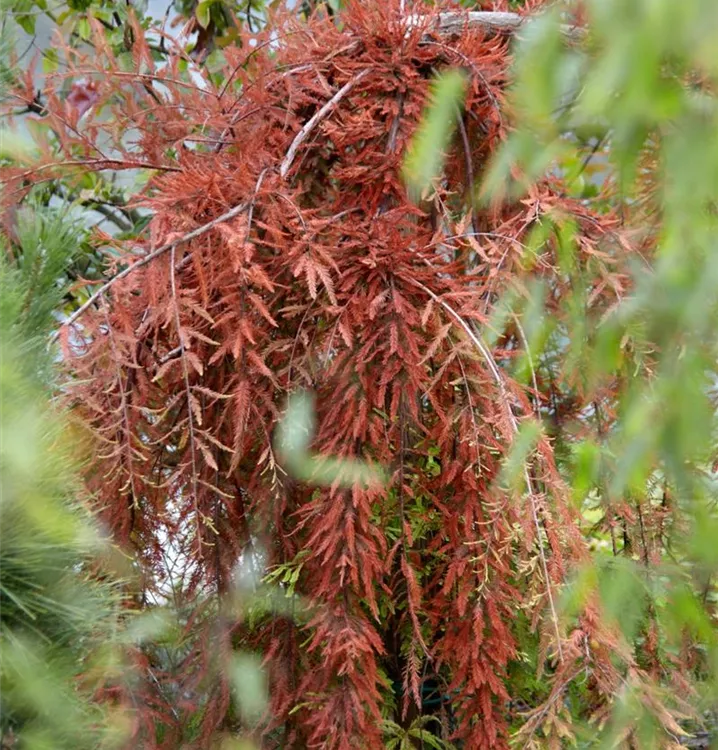 Rot-braun, schuppenförmige Rinde macht diese Pflanze zu einem Blickfang in jedem Garten.