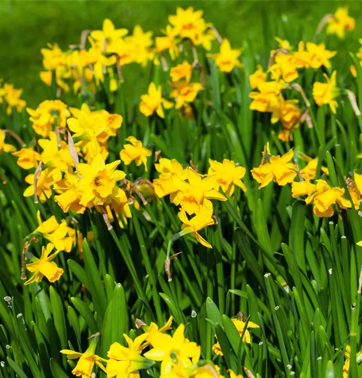 Die gelben, radförmigen oder röhrenförmigen Blüten der Alpenveilchenartigen Garten-Narzisse 'Tête à Tête' erscheinen in Trauben von März bis April. Diese sind angenehm duftend.