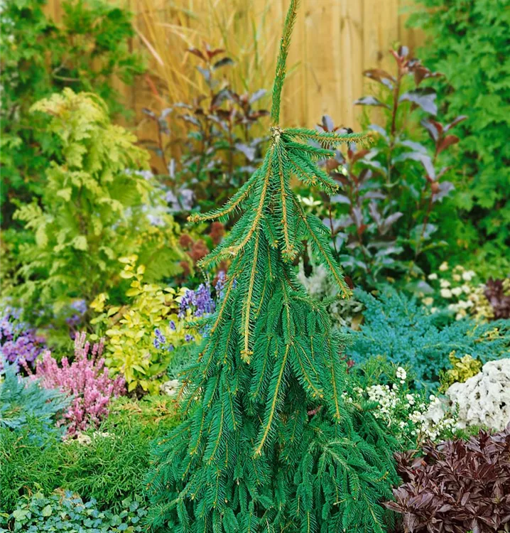 Die Rotfichte (Picea abies) ist ein Großbaum, welcher kegelförmig wächst und gewöhnlich eine Höhe von ca. 50 m und eine Breite von ca. 8 m erreicht. Ihre nadelförmigen Blätter haben eine dunkelgrüne Färbung. Dekorative braune Zapfen zieren Picea abies ab September. Dieses Gehölz ist gut frostverträglich. Sie bevorzugt sandigen, lehmigen Boden in sonniger bis halbschattiger Lage.