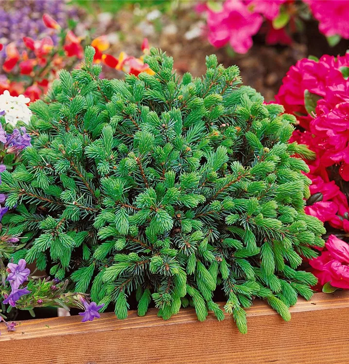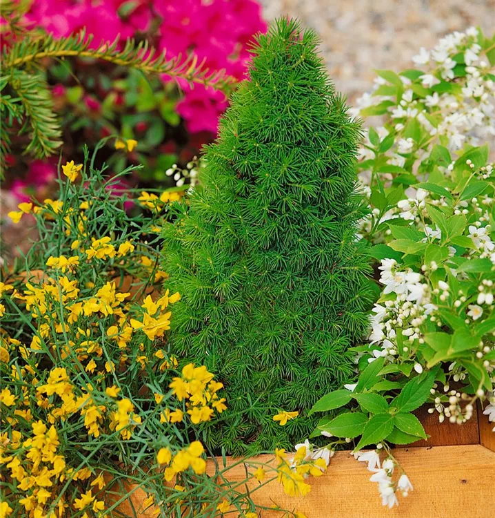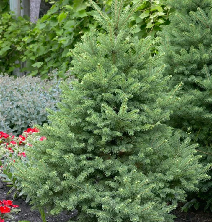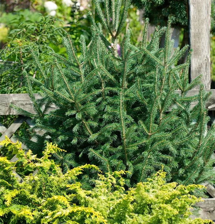 Die Weiß-Fichte (Picea glauca) ist ein Baum, welcher aufrecht wächst und gewöhnlich eine Höhe von ca. 5 m und eine Breite von ca. 2,5 m erreicht. Ihre nadelförmigen Blätter haben eine blau-grüne Färbung. Dieses Gehölz ist gut frostverträglich. Sie bevorzugt durchlässigen Boden in sonniger bis halbschattiger Lage.