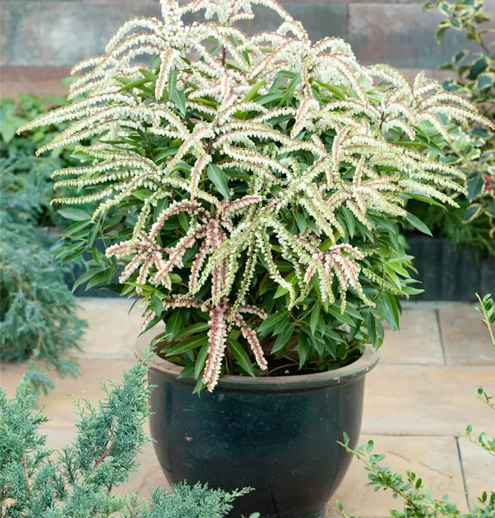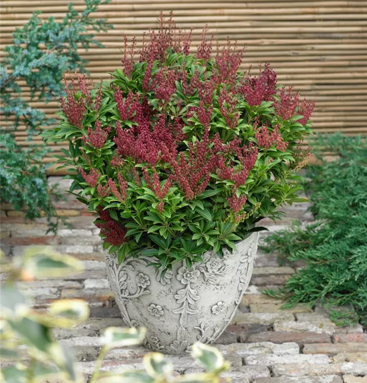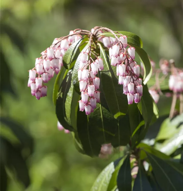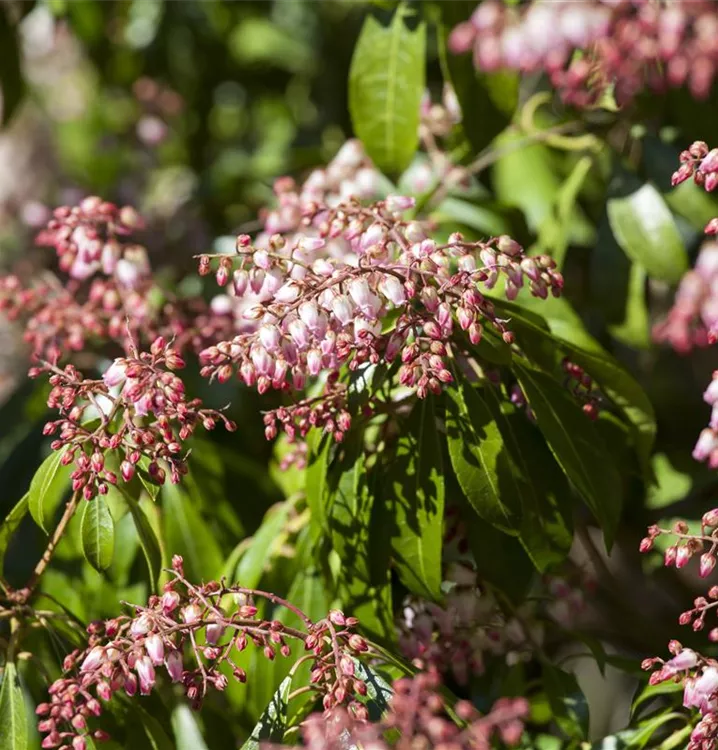 Das Japanische Schattenglöckchen (Pieris japonica) ein buschiger, breiter Strauch, der, je nach Sorte, Blüten in verschiedenen Farben hervorbringt. Seine Rinde ist rot-braun, streifenförmig eingerissen. An einem halbschattigen bis schattigen, windgeschützten Standort mit humosem, nährstoffreichem Boden erreicht es gewöhnlich eine Höhe von ca. 3 m und wird ca. 3 m breit.