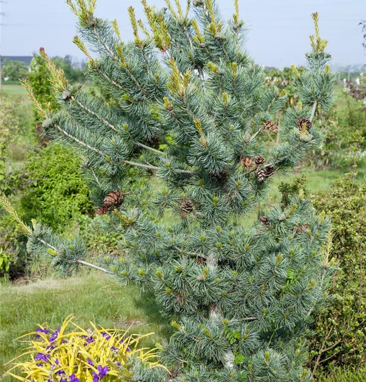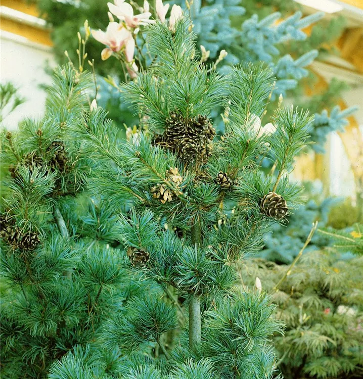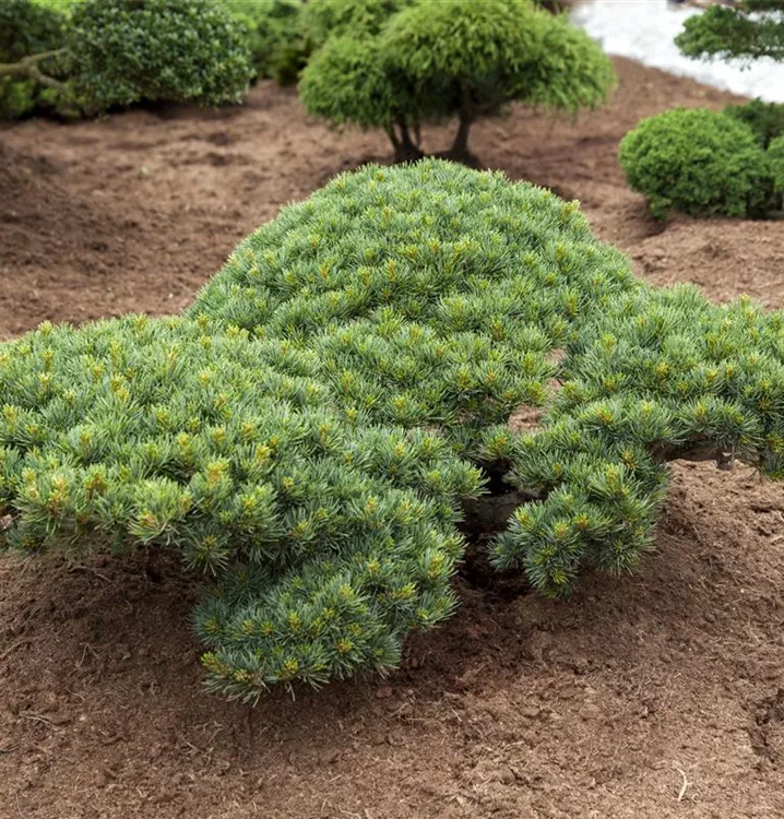 Die Blaue Mädchenkiefer 'Glauca' (Pinus parviflora) ist ein Kleinbaum, welcher aufrecht, ausladend, bizarr wächst und gewöhnlich eine Höhe von ca. 10 m und eine Breite von ca. 7 m erreicht. Ihre nadelförmigen Blätter haben eine silberblaue Färbung. Dieses Gehölz ist gut frostverträglich. Sie bevorzugt durchlässigen, kalkhaltigen Boden in sonniger Lage.