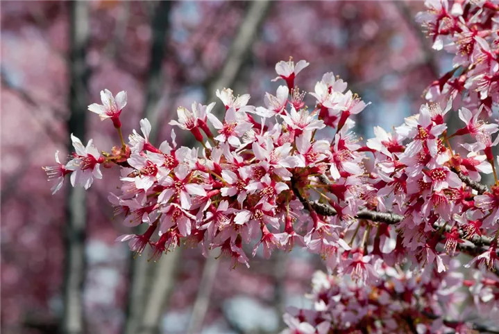 Die Zierkirsche 'Okame', Stamm (Prunus) ist eine Gartenpflanze, die rosafarbene Blüten hervorbringt. Sie erscheinen von März bis April. Besonders dekorativ ist der bronzefarbene Jungaustrieb. Ihre Rinde ist dunkelbraun.
