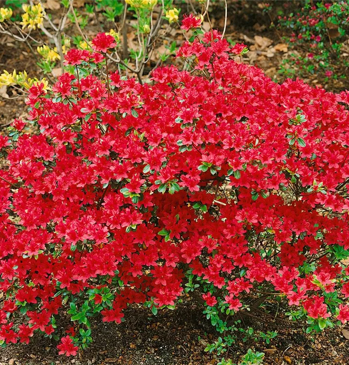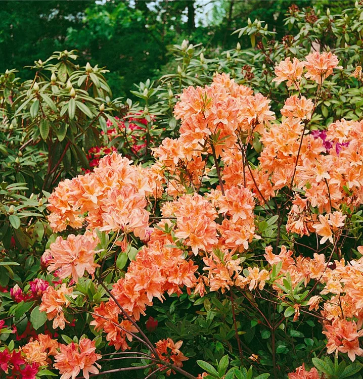 Die Japanische Azalee (Rhododendron molle) bringt von Mai bis Juni ein wahres Meer aus gelben, orangefarbenen, rosafarbenen bis dunkelroten Blüten hervor. Dieses aufrecht, breit wachsende Gehölz erreicht gewöhnlich eine Höhe von 2 - 2,5 m und eine Breite von 1,5 bis 2 m. Ein halbschattiger (bis schattiger) Standort und ein durchlässiger, lockerer, nährstoffreicher, saurer Boden schaffen optimale Bedingungen für ein gesundes Wachstum. Die Japanische Azalee ist gut frostverträglich.