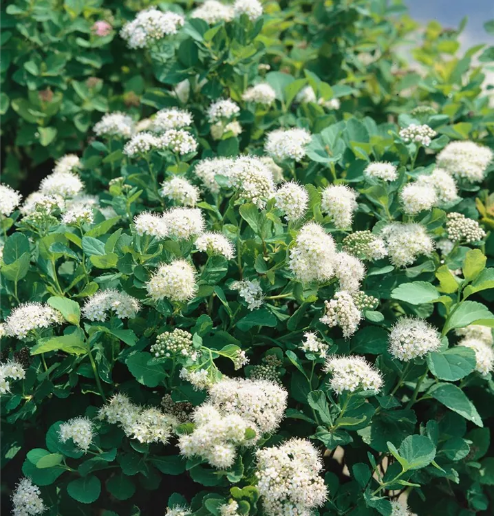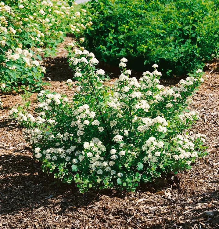 Die weißen Blüten der Birkenblättrigen Spiere erscheinen in Doldentrauben im Juni.