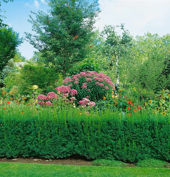 Besonders dekorativ sind die roten Zapfen von Taxus x media 'Straight Hedge'. Diese erscheinen ab September.