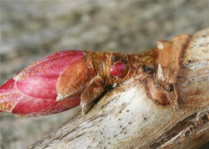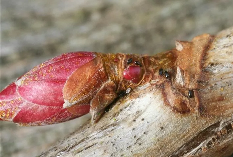 Schon bald nach dem Austrieb verkräuseln Bätter und Triebspitzen durch die Saugtätigkeit der gelblich-grauen bis grünen Blattläuse.