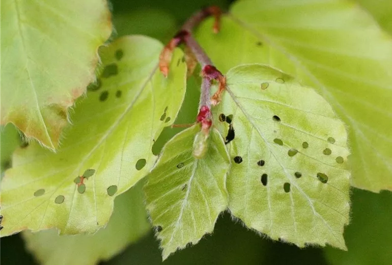 Der kleine schwarze Buchenspringrüssler (Rhynchaenus fagi) überwintert als Käfer. Im Frühjahr fressen die Tiere Löcher ins Laub. Später legen sie ihre Eier an die Buchenblätter ab. Die daraus schlüpfenden Larven fressen das Blattgewebe zwischen oberer und unterer Blatthaut. Dieses minierte Blattgewebe färbt sich braun.