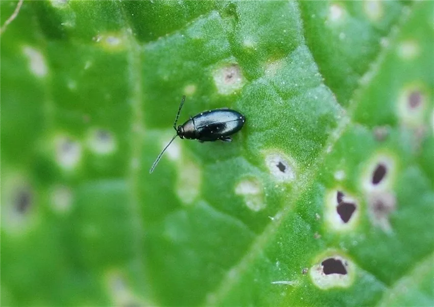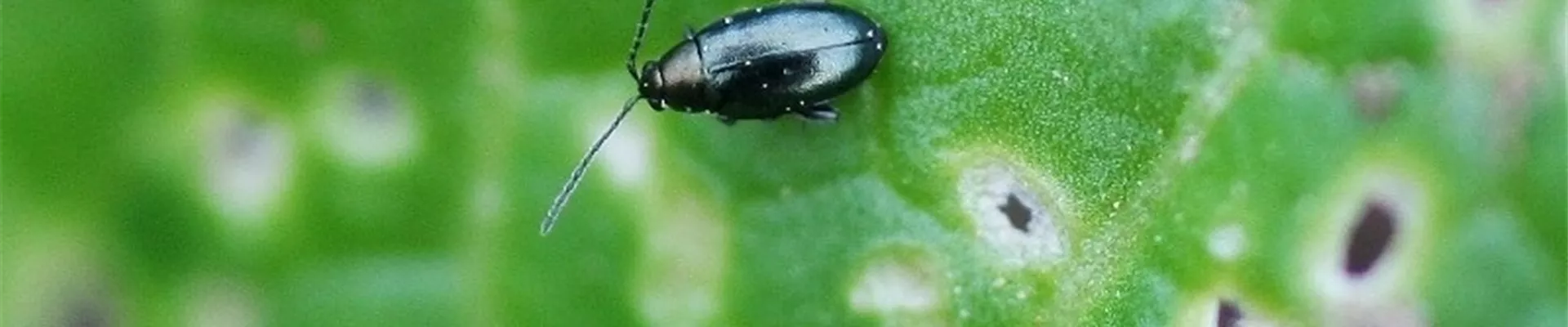 Bei genauerem Hinschauen erkennt man auf Blättern und Boden sehr kleine schwarze oder gelb gestreifte Käfer, die auffällig gut springen können.