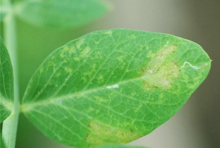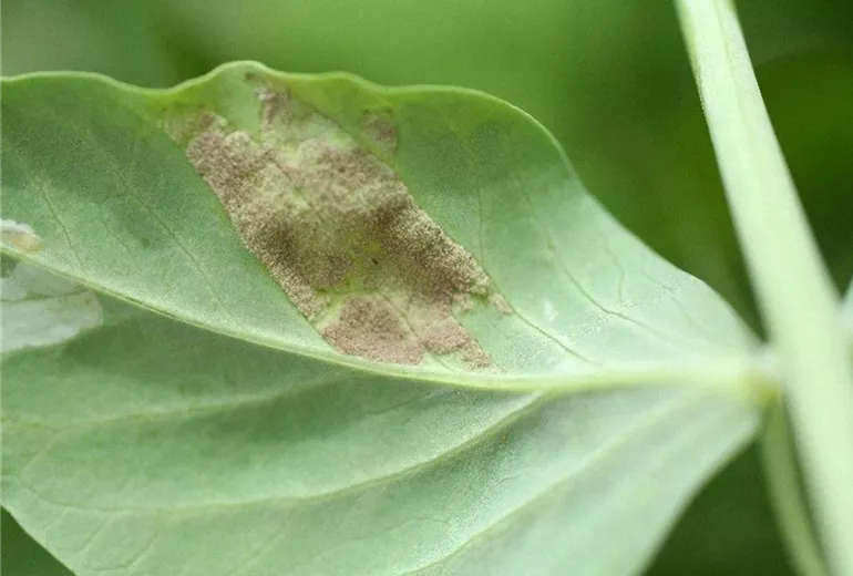 Der Falsche Erbsenmehltau (Peronospora viciae) gehört zur Gruppe der Falschen Mehltaupilze, die vor allem bei feuchter Witterung verstärkt auftreten können.