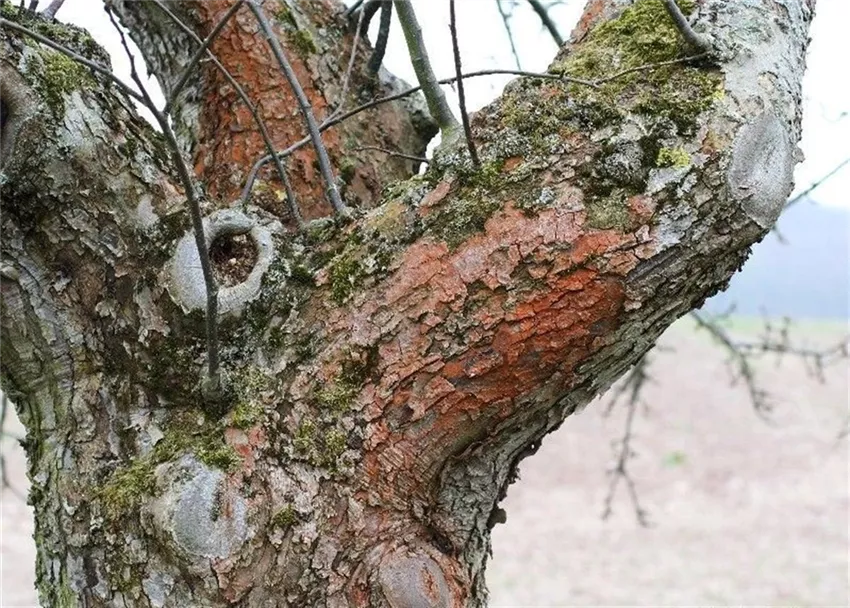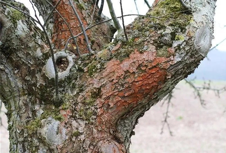 Diese auffällige Verfärbung wird durch Algen verursacht, die sich unter feuchten Bedingungen auf der Borke älterer Bäume entwickeln.