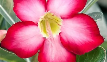 Die Wüstenrose (Adenium obesum) ist eine Pflanze mit mittelgrünen, lanzettlichen, ganzrandigen Blättern. Die röhrenförmigen Blüten erscheinen im April. Diese strauchartige und sukkulente Pflanze gedeiht am besten an einem sonnigen Standort.