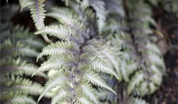 Der Regenbogenfarn 'Metallicum' (Athyrium niponicum) ist mit seiner silbergrauen Blattfärbung ein dekoratives Gestaltungselement im Garten, welches sich an einem halbschattigen Standort mit einem möglichst durchlässigen, kalkfreien Boden am wohlsten fühlt. Bei günstigen Bedingungen erreicht diesen winterhartn Farn eine Höhe von ca. 40 cm und wird bis zu 60 cm breit.