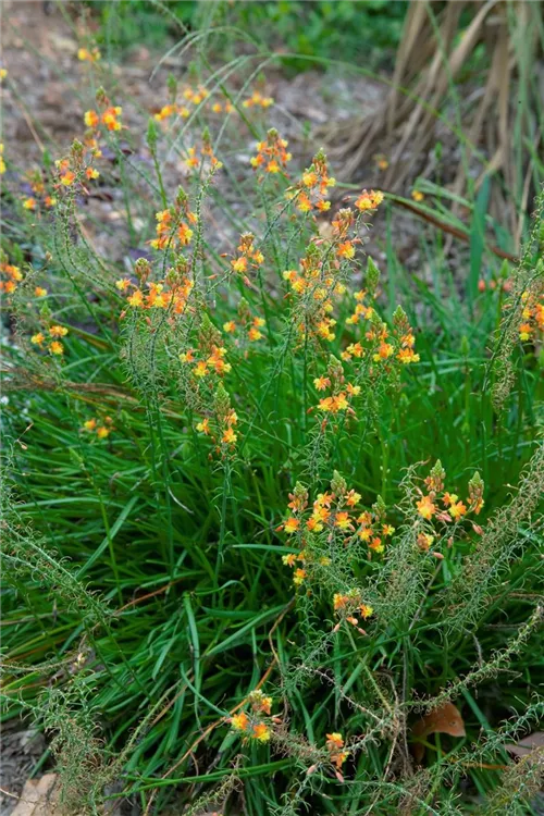 Bulbine frutescens bildet sternförmige, in Ähren angeordnete, gelb-orangene Blüten ab Mai.
