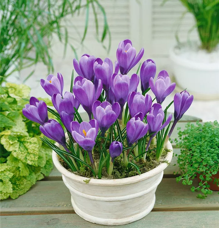 Der Frühlings-Krokus (Crocus vernus) blüht über Monate hinweg. Je nach Sorte, erscheinen die dekorativen Blüten in den Farben Weiß, Lila, Gelb und Blau. Bevorzugt wird ein sonniger bis halbschattiger Standort und eine durchlässige Erde.