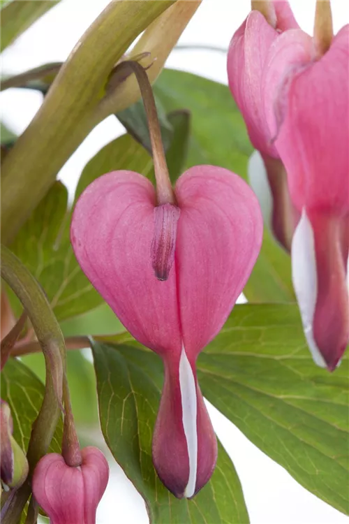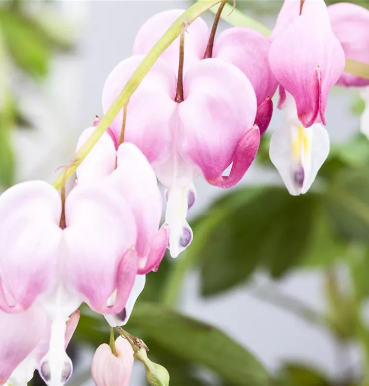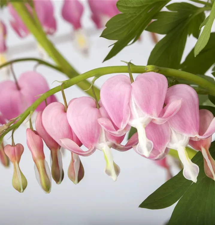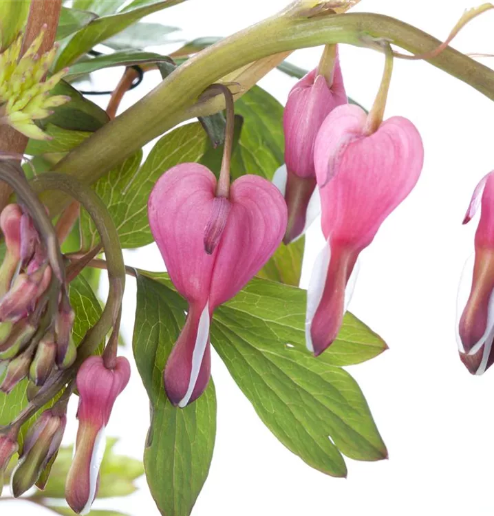 Dicentra spectabilis bildet in Trauben angeordnete, rosa-weiße Blüten ab Mai.