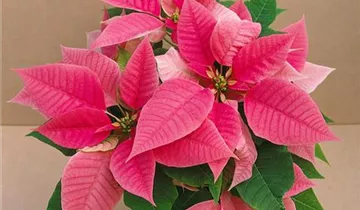 Der Weihnachtsstern (Euphorbia pulcherrima) ist eine rosa blühende Pflanze, die breit lanzettliche, lanzettliche Blätter trägt. Diese buschige Pflanze gedeiht am besten an einem sonnigen Standort.