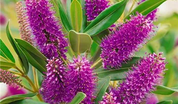 Die Strauchveronika (Hebe x andersonii) eine buschige Gartenpflanze, die, je nach Sorte, lippenförmige Blüten in verschiedenen Farben hervorbringt. An einem sonnigen bis halbschattigen Standort mit durchlässigem, nährstoffreichem Boden erreicht sie gewöhnlich eine Höhe von ca. 60 cm und wird ca. 50 cm breit.