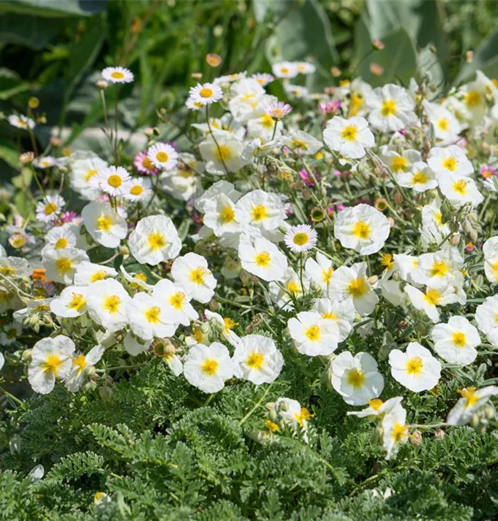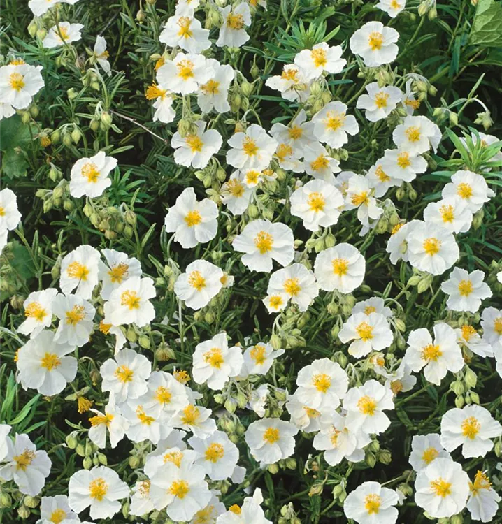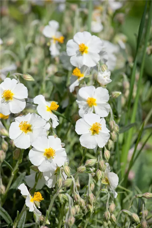 Helianthemum cultorum, weiß bildet schalenförmige, weiße Blüten ab Mai.