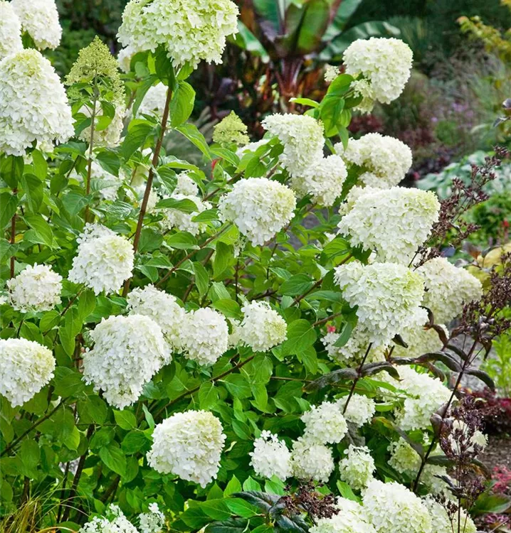 Die Rispenhortensie (Hydrangea paniculata) ein aufrechter Strauch, der, je nach Sorte, Blüten in verschiedenen Farben hervorbringt. An einem sonnigen bis halbschattigen Standort mit durchlässigem, humosem Boden erreicht sie gewöhnlich eine Höhe von ca. 4 m und wird ca. 3 m breit.