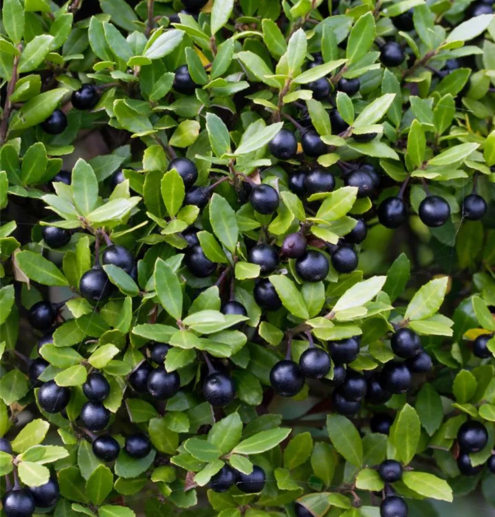 Besonders dekorativ sind die schwarzen Früchte von Ilex crenata. Haften sehr lange.