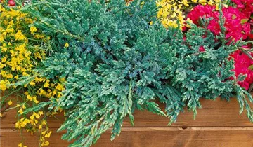 Besonders dekorativ sind die blauen Zapfen von Juniperus squamata. Diese erscheinen ab August.