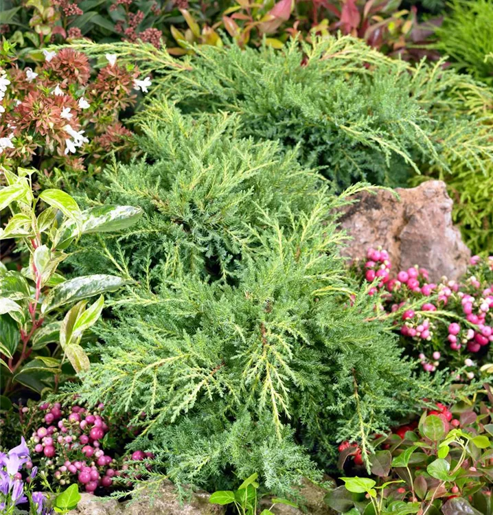 Pfitzer-Wacholder 'Gold Star' ist ein breit und dicht wachsender Strauch oder Kleinstrauch. Er erreicht gewöhnlich eine Höhe von 50 - 60 cm und wird ca. 2 - 2,5 m breit.