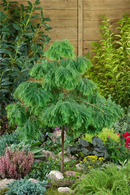 Chinesisches Rotholz 'Matthaei Broom' ist ein kegelförmig wachsender Großbaum. Es erreicht gewöhnlich eine Höhe von 25 - 40 m und wird ca. 7 - 10 m breit. Rasch wachsend. In der Regel wächst es 0,4 - 1 m pro Jahr.