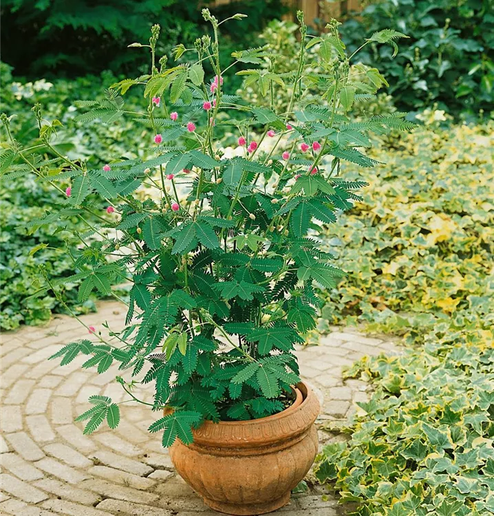 Die Mimose (Mimosa pudica) ist eine sehr beliebte Kübelpflanze. Ihre dekorativen Blüten erscheinen von April bis Oktober. Verwenden Sie bevorzugt die spezielle Kübelpflanzenerde, denn sie verdichtet sich über längere Zeit nicht.