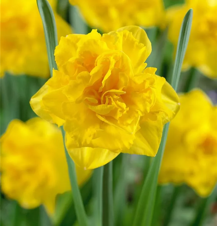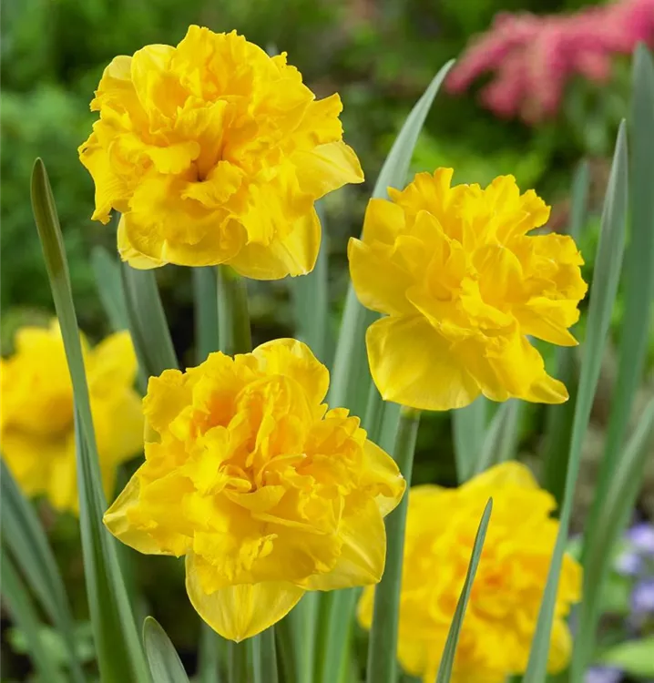 Die gelben, gefüllten, radförmigen oder röhrenförmigen Blüten der Trompeten-Narzisse 'Gold Medal' erscheinen in Trauben im April. Diese sind angenehm duftend.