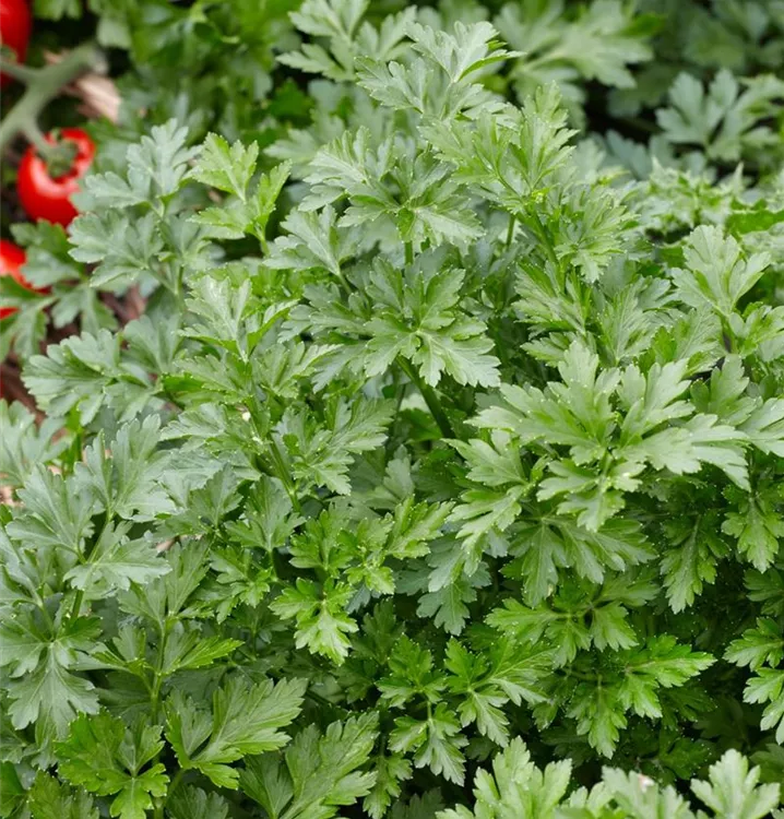 Zum Verzehr geeignet. Die dunkelgrünen, gewellten Blätter sind gefiedert und überzeugen mit aromatischem Geschmack.