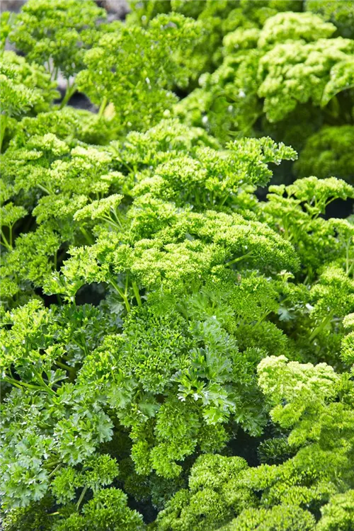 Zum Verzehr geeignet. Die dunkelgrünen, gewellten Blätter sind gefiedert und überzeugen mit aromatischem Geschmack.